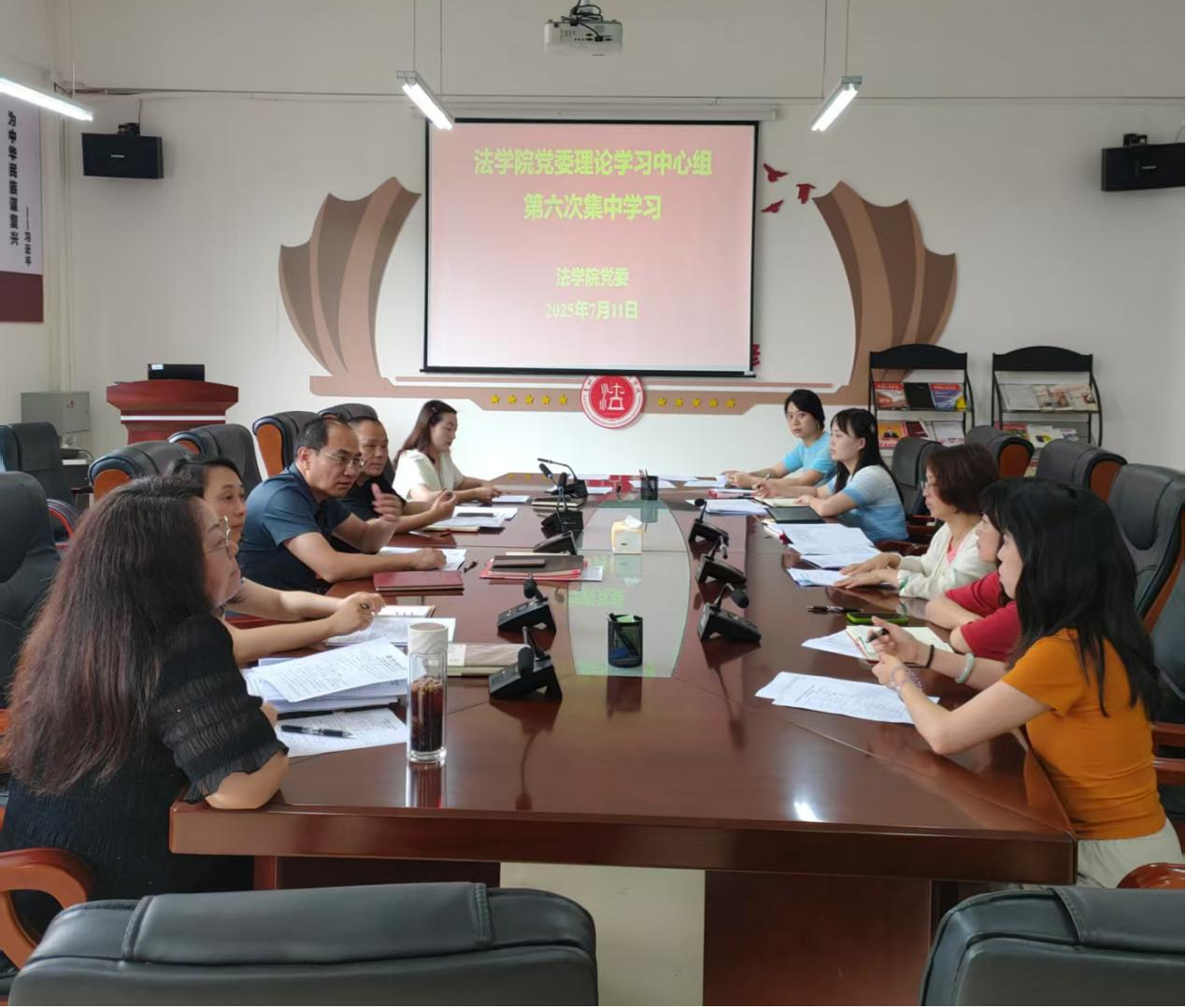 (法学院 潘吉脉 报道|摄影 )7月11日下午,法学院党委理论学习中心组召开2025年度第六次集体学习(扩大)研讨会,院党委书记邵新顺主持会议并讲话,院领导曹务坤、代莉莎、彭华、宋昭澜出席会议,各党支部书记及科级干部参会。