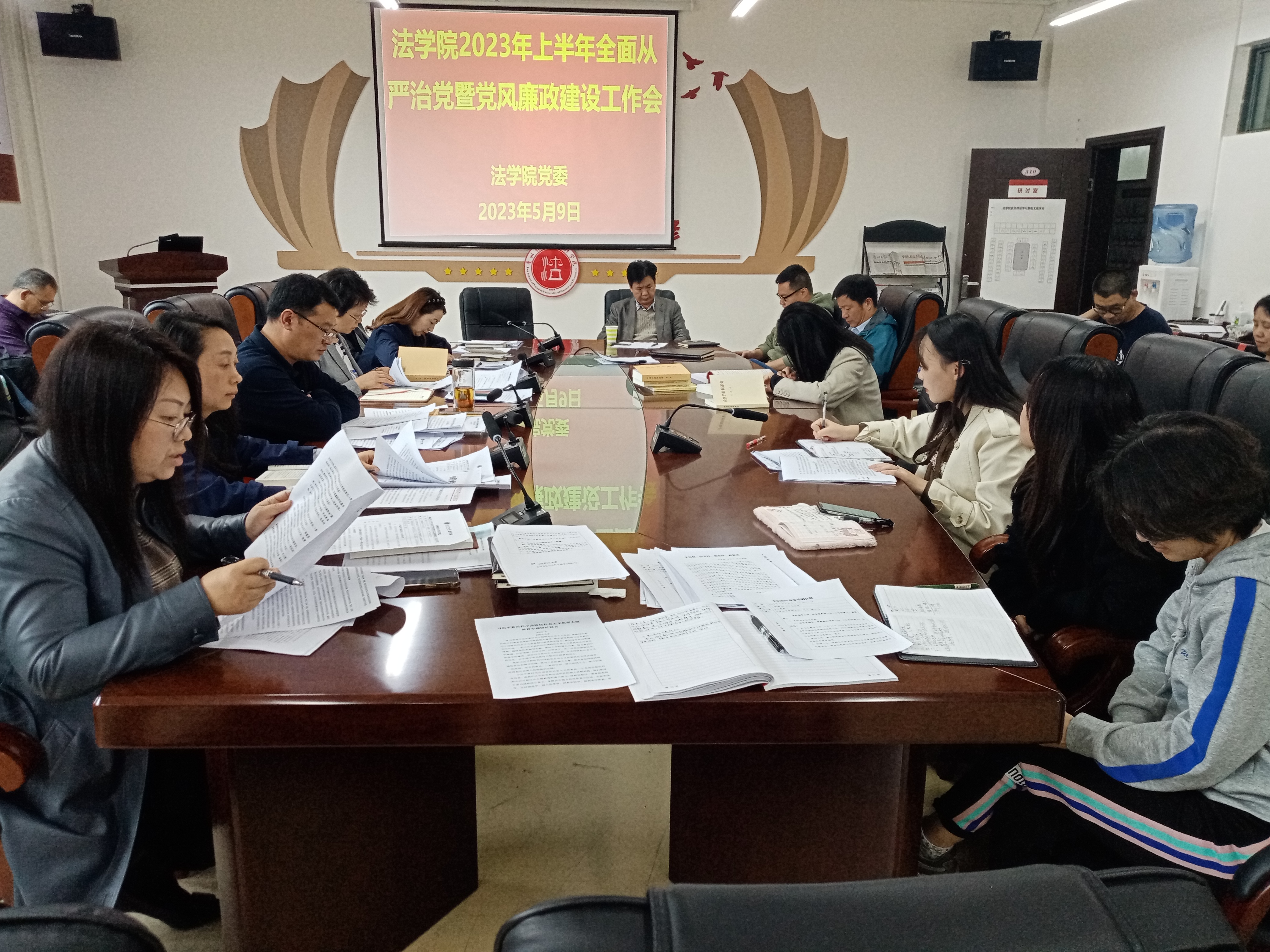 (报道|摄影 徐方 )2023年5月9日,法学院党委在文德楼A8-310会议室召开2023年上半年全面从严治党暨党风廉政建设工作会。学院领导、各科室负责人、系负责人、支部书记等全体行政人员参加会议。会议由学院党委书记詹伟主持。
