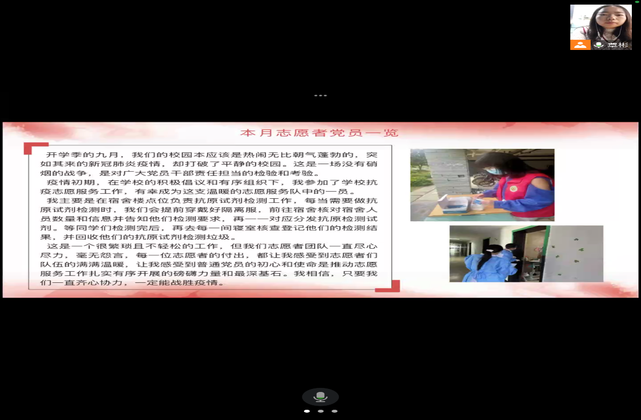 本次交流活动伊始,郭雪向同学们强调了疫情防控期间的注意事项,支部党员龙育君作为志愿服务的志愿代表进行发言,与党员们交流了其在疫情期间服务工作的心得与感悟,她作为楼栋抗原试剂检测员,主要负责信息登记核、发放抗原试剂、核对检测结果、对试剂进行回收。龙育君表示通过此次志愿服务让她成长收获了许多,她相信只要齐心协力,就一定能打赢这场疫情防控的攻坚战。