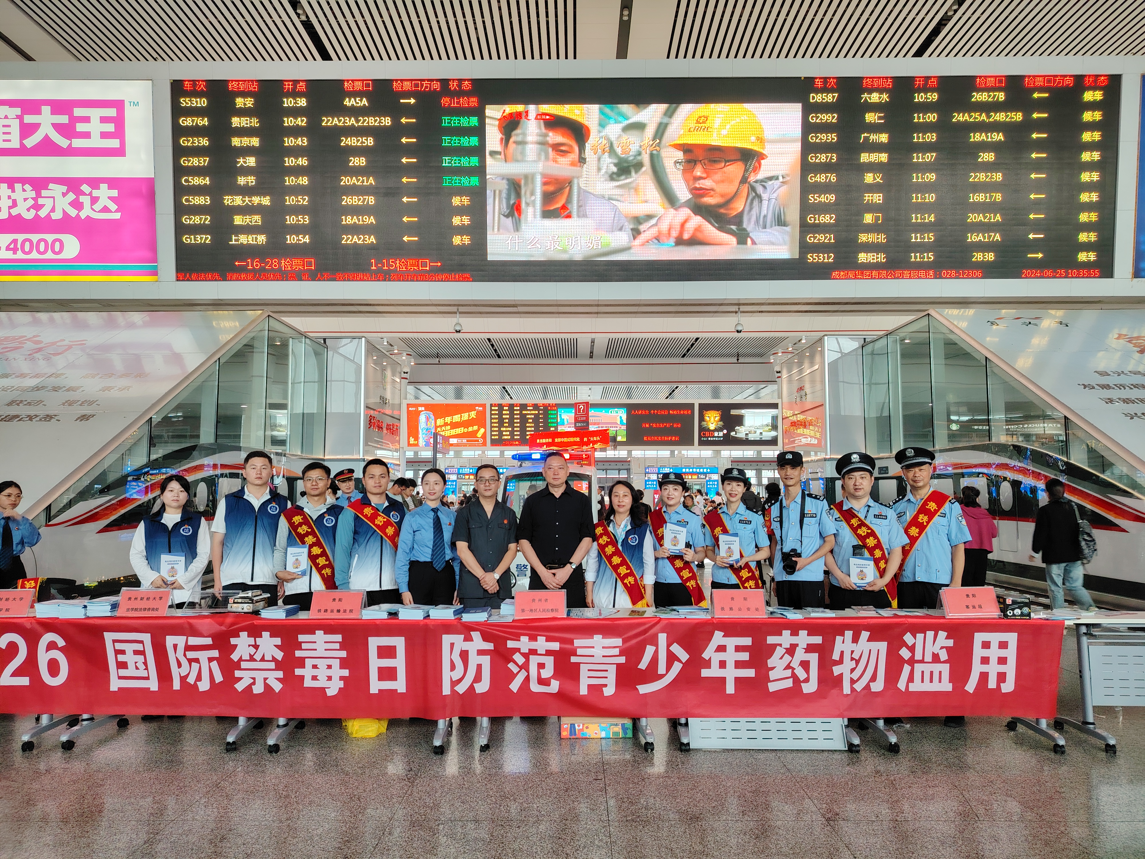禁毒宣传以“防范青少年药物滥用”为主题,贵阳铁路公安处禁毒支队联动好博在线登录官网法学院、贵州省第一地区人民检察院、贵阳铁路运输法院、贵阳铁路疾控中心、贵阳客运段、贵阳北站相关单位共同开展,通过发放禁毒宣传资料、展示禁毒展板、开展现场普法咨询等多种形式,向过往旅客普及禁毒知识,增强旅客防范毒品的意识和能力,让人们认知毒品危害、远离毒品,呼吁大家共同抵制毒品,营造无毒社会。