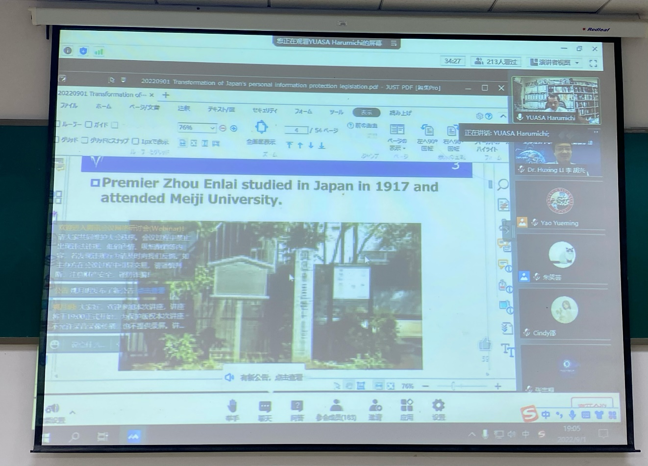 (法学院  图文/报道  杨洁芮)为促进数字法治国际交流合作,提升数字经济司法治理水平,2022年9月1日晚19点,法学院组织在校研究生200余人在乐学楼1-1在线观看了由北京大学法学院组织的“数字与法治”系列论坛。本次论坛由中国学者和日本、欧洲、美国的知名学者共同探讨“全球视野下的隐私与数据保护法”这一核心主题。此次专题为“日本个人信息保护立法的转变”,由日本明治大学全球治理研究科教授汤浅垦道(Yuasa Harumichi)作为开讲学者。